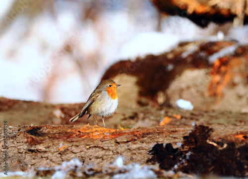 Rudzik (Erithacus rubecula) w zimie podczas poszukiwania pożywienia wsród opadłych liści. Dzięki rdzawej barwie czoła, boków głowy, piersi i jednolicie brązowym sterówkom dorosłe rudziki są stosunkow
