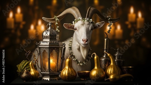 Mysterious goat in candlelit setting with apothecary jars and eerie ambiance