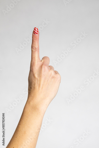 palec wskazujący kobiety, skierowany ku górze, Białe tło