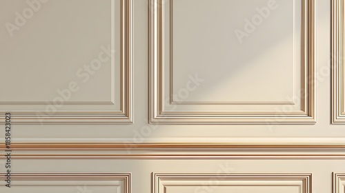 White wall with a row of wooden panels. The panels are arranged in a way that creates a sense of depth and texture. The light shining on the wall highlights the intricate details of the panels