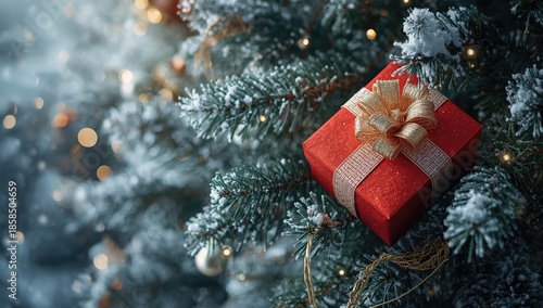 A wrapped present on a snow-dusted tree branch, winter holiday decoration, seasonal observance