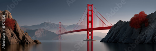 Red suspension bridge over bay at sunset panoramic landscape travel landmark and engineering architecture background