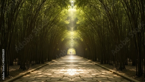 Serene forest pathway illuminated by sunlight filtering through dense foliage