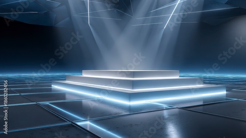 A geometric structure, composed of stepped platforms, illuminated from above and surrounded by an ethereal blue glow, set in a futuristic space