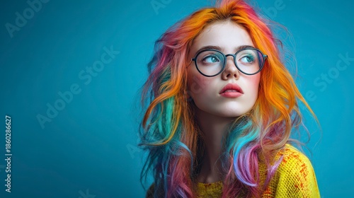 Portrait of a young woman with vibrant, multicolored hair, wearing round glasses, against a solid blue background