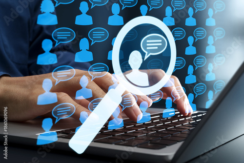 Sentiment analysis and opinion mining. Data analytics using NLP and machine learning. Marketer using laptop computer to detect emotions from social media.