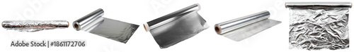 a collection of realistic photographs showcasing various states of shiny silver aluminum foil, rolled and crumpled, on black.