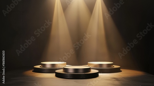 Three circular podiums illuminated by spotlight in a dark setting. The scene suggests a stage or award ceremony atmosphere.
