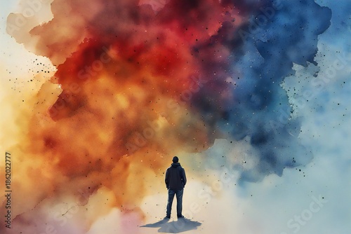 Composizione astratta di curve fluide e colori armonici ad acquerello, espressione di movimento, equilibrio emotivo ed energia visiva persona uomo o donna visto di spalle