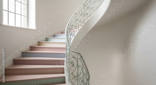 Elegant spiral staircase design with pastel colors and forged iron railing