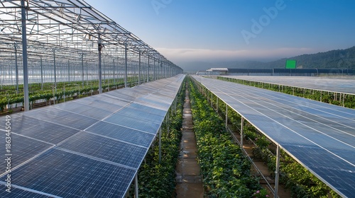 translucent photovoltaic panel array on agricultural greenhouse roof, intelligent drip irrigation cultivation racks below, background is crop growth monitoring screen and farmland