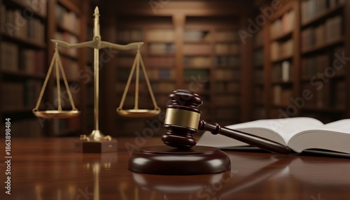 Justice and legal system concept featuring the scales of justice, gavel, and open law book in a prestigious library setting.