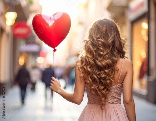 Miłość. Piękna młoda kobieta z czerwonym balonem w kształcie serca idzie ulicą miasta czekając na ukochanego. Walentynki.