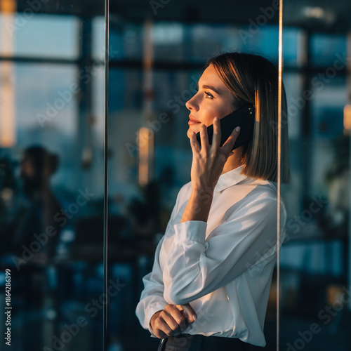 Kobieta pracująca w biurze trzyma telefon w dłoni, patrzący przez szybę, odbicie w szybie. Rozmawia przez telefon.