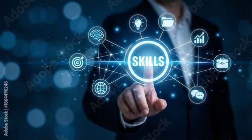 A professional is interacting with a glowing digital interface displaying various icons representing essential skills and technologies in a futuristic context high quality