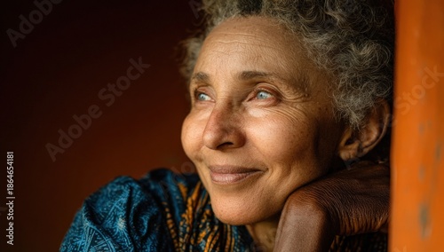 African American woman with curly gray hair, wearing a colorful patterned top, gazes thoughtfully while resting her chin on her hand, conveying a sense of serenity and introspection