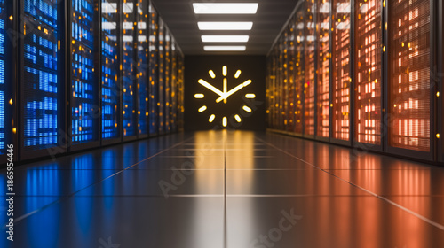 Time Critical Data Management: Server Room Hallway with Glowing Clock