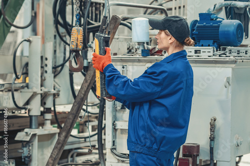 Professional female worker operating heavy machinery. Concept of women in industry, equality.
