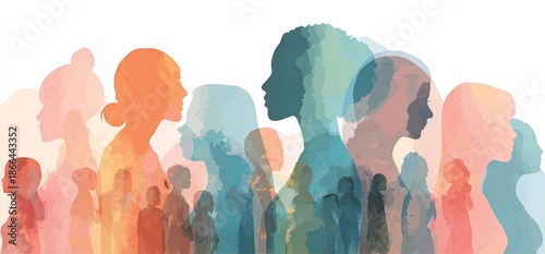 Silhouette portraits of women in layered watercolor hues, conveying diversity and unity