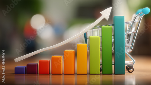 Rising bar chart beside a shopping cart symbolizing consumer spending growth retail sales increase and economic demand.