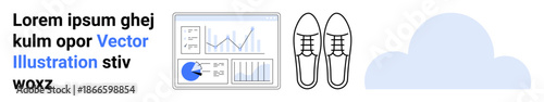 Analytics dashboard with charts, text content, minimal casual shoes, and cloud shape element. Ideal for web design, analytics, cloud technology, business, minimalism fashion simple landing page