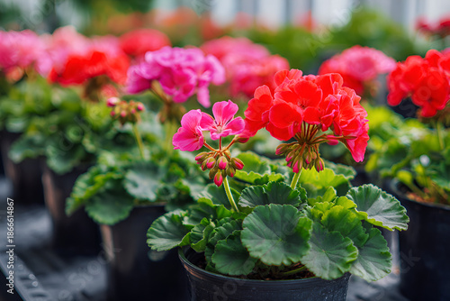 Pelargonie w doniczkach w szklarni, czerwone i różowe kwiaty balkonowe, uprawa roślin ozdobnych i wiosenna sprzedaż.