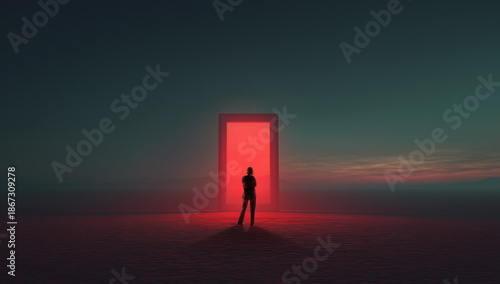 Moody cinematic composition with figure facing red illuminated doorway. Concept of inner conflict, bold decision moment, emotional tension, psychological depth, dramatic storytelling for advertising.