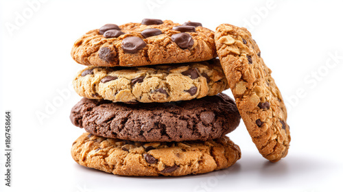 stack of chocolate chip and oatmeal cookies on white background