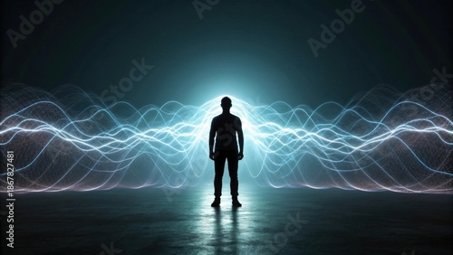 Human silhouette surrounded by glowing electromagnetic waves