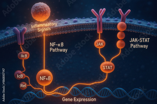 Medical diagram of JAK STAT signaling pathway in cell biology. detailed look at complex gene expression process, showing an intricate intracellular view