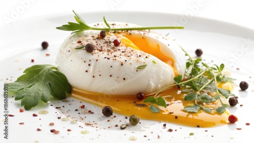 Poached egg with a soft center and spicy greens on a clean background. An appetizing accent on the naturalness and sophistication of the dish.