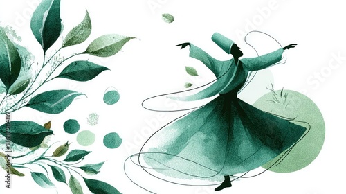 Abstract Green Whirling Dervish With Flowing Lines and Nature Motifs