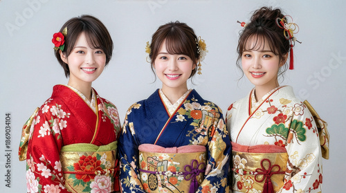 成人式の振袖を着た3人の女性たち