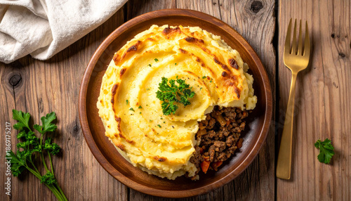 Shepherd’s Pie on Wooden Plate on Rustic Wooden Table