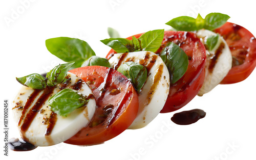 Gourmet Caprese salad served with aromatic basil leaves, ripe tomato slices, and balsamic glaze isolated on transparent background PNG