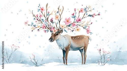 A whimsical reindeer adorned with floral branches stands in a snowy landscape, blending nature and art in a serene winter scene.
