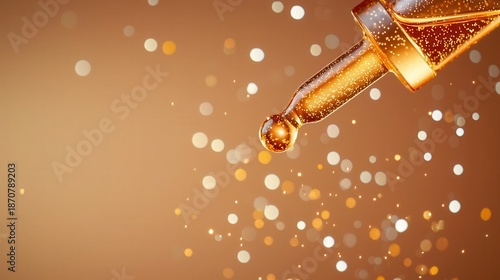 Macro of a serum droplet forming on a dropper, glowing softly, surrounded by delicate sparkles and neutral background
