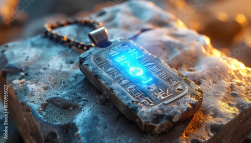 Ancient mystic amulet pendant with glowing runes on stone rock. Fantasy artifact jewelry with mystical power. Adventure game item find.