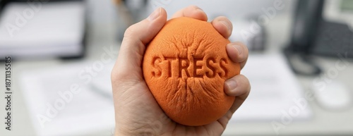 Adult hand squeezing orange stress ball with the word STRESS embossed, in an office environment, symbolizing relief and coping mechanisms