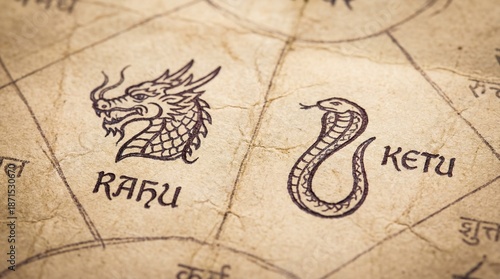 Rahu and Ketu symbols in Vedic astrology. Dragon head depicting Rahu and coiled serpent for Ketu on ancient paper with Sanskrit script. Hindu mythology and lunar nodes concept for karmic and