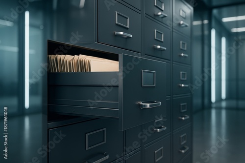Open drawer in dark file cabinet filled with documents in futuristic office hallway. Ai generative. Ai generative