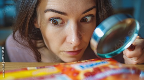 Woman Analyzing Food Ingredients with Magnifying Glass for Clarity and Detail in a Well-Lit Kitchen Setting