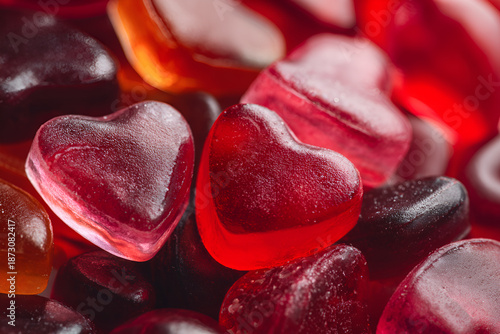 Żelki w kształcie serca w czerwonych i różowych odcieniach jako słodki romantyczny deser.
