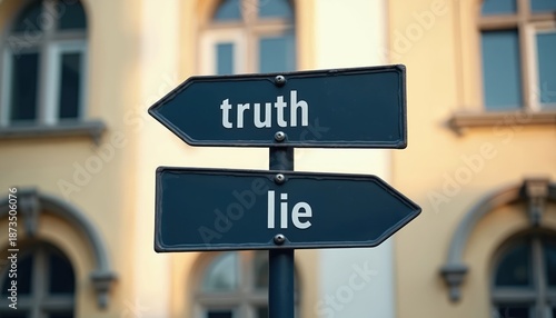 Two road signs point in opposite directions, one labeled truth and the other lie. This image visualizes a choice between honesty and deception.