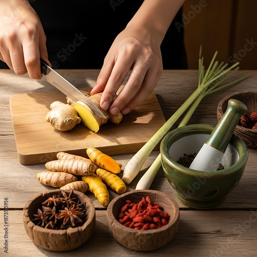 Hands meticulously preparing fresh ginger root, surrounded by diverse natural spices for wellness and health