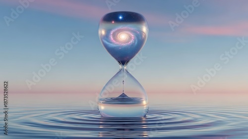A cosmic hourglass containing a galaxy rests on the surface of water at sunset