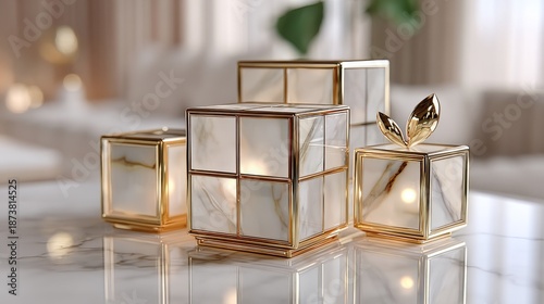 Dramatically spotlighted frosted glass and golden translucent geometric forms