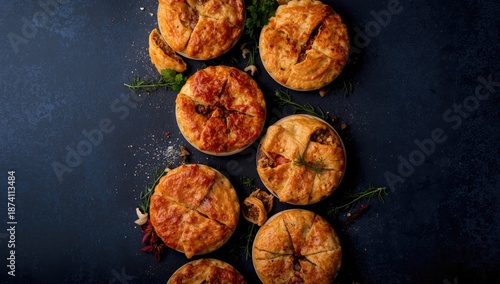 Meat-filled pies with seasonings arranged on a dark-blue surface, designed for food photography and layout use