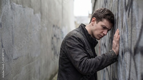 Young man leaning head and hand on a graffiti wall in a desolate urban alley for mental health struggle concept and emotional despair