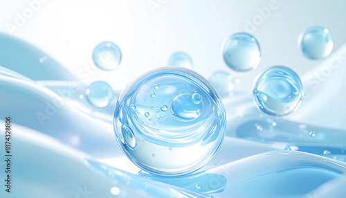 透明ジェルと水色バブルの美容成分イメージ ヒアルロン酸・セラミド・ナイアシンアミド配合の高保湿スキンケア科学背景 / Transparent gel and light blue bubbles, hyaluronic acid, ceramide, niacinamide, high moisturizing skincare science background